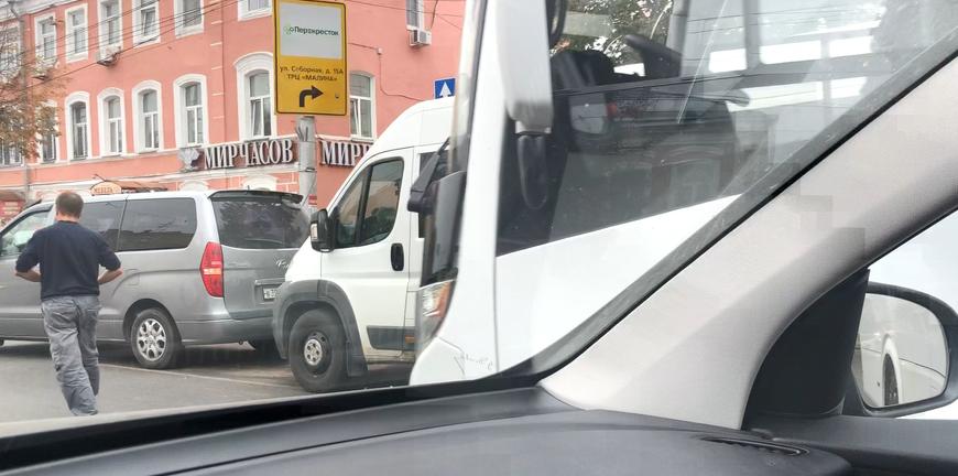 Пробка образовалась из-за аварии. Столкнулись три автомобиля: минивэн, маршрутное такси и коммерческий автобус.
