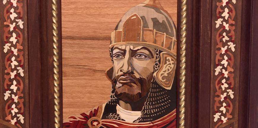 Из разноцветного шпона легко складывается орнамент, пейзажи, жизнь русских деревень, фигуры животных. А вот картину с изображением полководца Александра Невского Олег Дёмкин решил подарить своему внуку. Рассказывает, что над ее созданием пришлось трудится почти полгода, кропотливо выкладывая из мельчайших деталей портрет великого князя.
