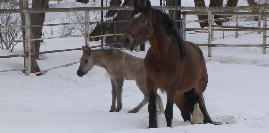 А это первая прогулка, первый снег и первые препятствия для Эконики, которые она на радость всем научным сотрудникам с легкостью преодолевает. Традиционно животные, рожденные с помощью ЭКО, не отличаются физической силой, но рязанская чудо-лошадь опровергла все прогнозы, особенность рождения выдает только разная с матерью масть.