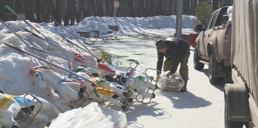 Веселый паровозик пока еще едет по маршруту, но очень скоро движение здесь закроется. Вынужденные каникулы связаны с предстоящим половодьем. А вот лошадки на карусели уже никого не катают, аттракцион на этой неделе полностью разберут.