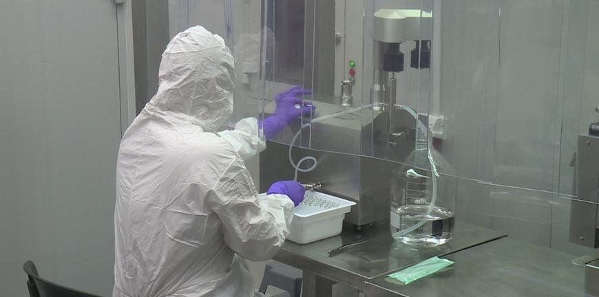 За стеклом, в стерильной зоне, все ключевые операции производства. Здесь готовят раствор гиалуроновой кислоты на основе собственной формулы. В зависимости от концентрации он будет служить косметическим целям — это так называемые уколы красоты — биоревитализанты и филеры. Или же назначение может быть лечебным — на производстве изготавливают внутрисуставные импланты, которые помогают больным артрозом. Предприятие стремится к автоматизации процесса, и скоро такая возможность появится. Приобрели маркировочную линию: то, что сейчас сотрудники делают вручную, скоро будет выполнять машина.