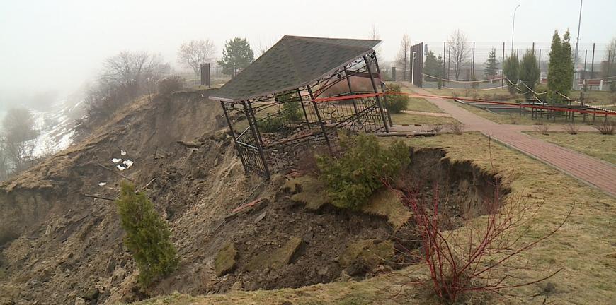 На самом краю оказалась беседка. По счастливой случайности никто не пострадал. Происшествие связывают с дождями и разливом ближайших к дому озер.